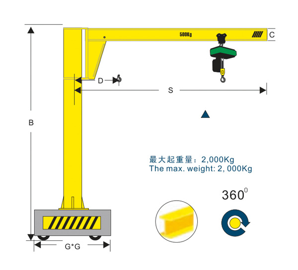 移動式旋臂起重機,它是一種可以移動的懸臂起重機。移動式懸臂吊更具靈活機動、適應(yīng)性廣等特點,是自動生產(chǎn)線上必備的單獨應(yīng)急吊裝設(shè)備,有了它能確保生產(chǎn)線暢通無阻。移動式旋臂起重機在300°的回轉(zhuǎn)懸臂的一端上配置環(huán)鏈電動葫蘆(或鋼絲繩電動葫蘆),用于對貨物或工件的起吊作業(yè):另一端設(shè)置配重,與起重臂相對同時回轉(zhuǎn),起平衡作用。廣泛適用于廠礦、車間、野外,倉庫小型設(shè)備安裝。貨物和工件裝卸,以及建筑低矮不宜架設(shè)行車等場所。