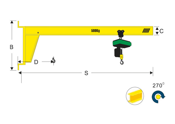 墻壁式旋臂吊只需簡單的安裝在墻面或立柱上,不占用地面面積;立柱式旋臂吊的立柱占地小,可以用預埋地腳螺栓或重型安卡螺栓等方式固定。如果需要,我們可以提供地腳螺栓和安裝模板。