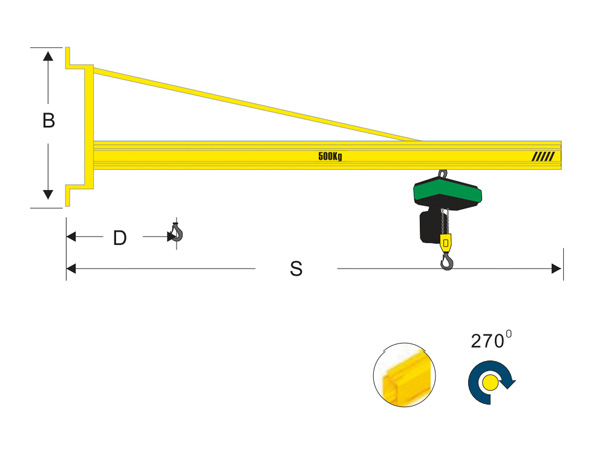 墻壁式旋臂起重機(jī)是根據(jù)用戶需要設(shè)計(jì)的專用起重設(shè)備。具有結(jié)構(gòu)新穎、合理、簡(jiǎn)單、操作使用方便、回轉(zhuǎn)靈活、自重輕、載荷移動(dòng)靈活等優(yōu)點(diǎn),是節(jié)能的物料吊運(yùn)裝備。可廣泛利用于廠礦、車間的生產(chǎn)線、裝配線和機(jī)床的上下活及倉庫、碼頭等場(chǎng)合的重物吊運(yùn)。墻壁式旋臂起重機(jī)(墻壁吊)由支架、旋臂裝置及環(huán)鏈電動(dòng)葫蘆等組成。懸臂固定在墻壁或水泥柱上,可根據(jù)用戶需求進(jìn)行回轉(zhuǎn)。回轉(zhuǎn)部分分為手動(dòng)回轉(zhuǎn)和電動(dòng)回轉(zhuǎn)。環(huán)鏈電動(dòng)葫蘆安裝在懸臂軌道上,用于起吊重物。本機(jī)主要由:懸臂、回轉(zhuǎn)裝置、環(huán)鏈電動(dòng)葫蘆組成。環(huán)鏈電動(dòng)葫蘆有起重和在橫梁上往復(fù)運(yùn)行的功能。懸臂梁可由回轉(zhuǎn)裝置上的的減速機(jī)帶動(dòng)滾輪進(jìn)行回轉(zhuǎn)運(yùn)動(dòng)。電器控制箱安裝在環(huán)鏈葫蘆上。本機(jī)操作通過手電門按鈕實(shí)現(xiàn)。手電門有八個(gè)按鈕,分別控制快升、快降、慢升、慢降、左右回轉(zhuǎn)及葫蘆小車的水平前后行走。
